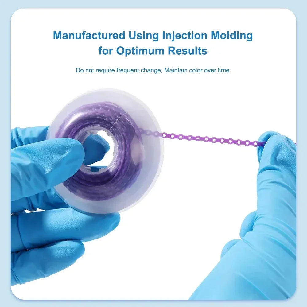 Power Chain are easy-to-use continuous chains of modules for ligation, consolidation and anterior retraction. Superior color stability, fade resistant,High elasticity with superior memory and rebound .Manufactured using injection molding for optimum results. Do not require frequent change,Maintain color over time. We control production every step of the way to deliver optimal elasticity and retention. From the first piece of chain to the Continuous, gentle force for predictable tooth movement. Features a unique urethane formulation, Latex–Free.